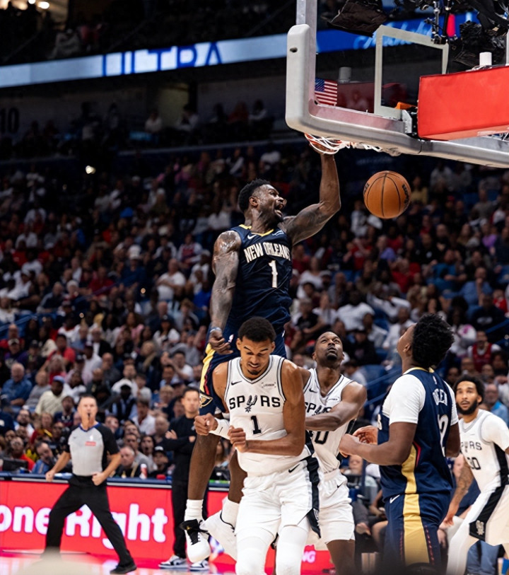 今天比赛过程一波三折,充满戏剧性。开局马刺手感冰凉,失误频发,鹈鹕凭借锡安强攻内线迅速占据主动。锡安首节冲击篮筐得手,文班亚马不甘示弱以暴扣回应,两人上演激烈对飙。然而文班亚马凭借身高臂展优势全面压制“胖虎”,锡安后续冲框多次被无情封盖。鹈鹕靠普尔火力救场,他连中两记三分,帮助球队首节仅27-30落后3分。次节风云突变,文班亚马化身进攻终结者,连续单打得手,展现无可阻挡的统治力。鹈鹕则凭借整体配合反扑,半场结束前竟反超1分。